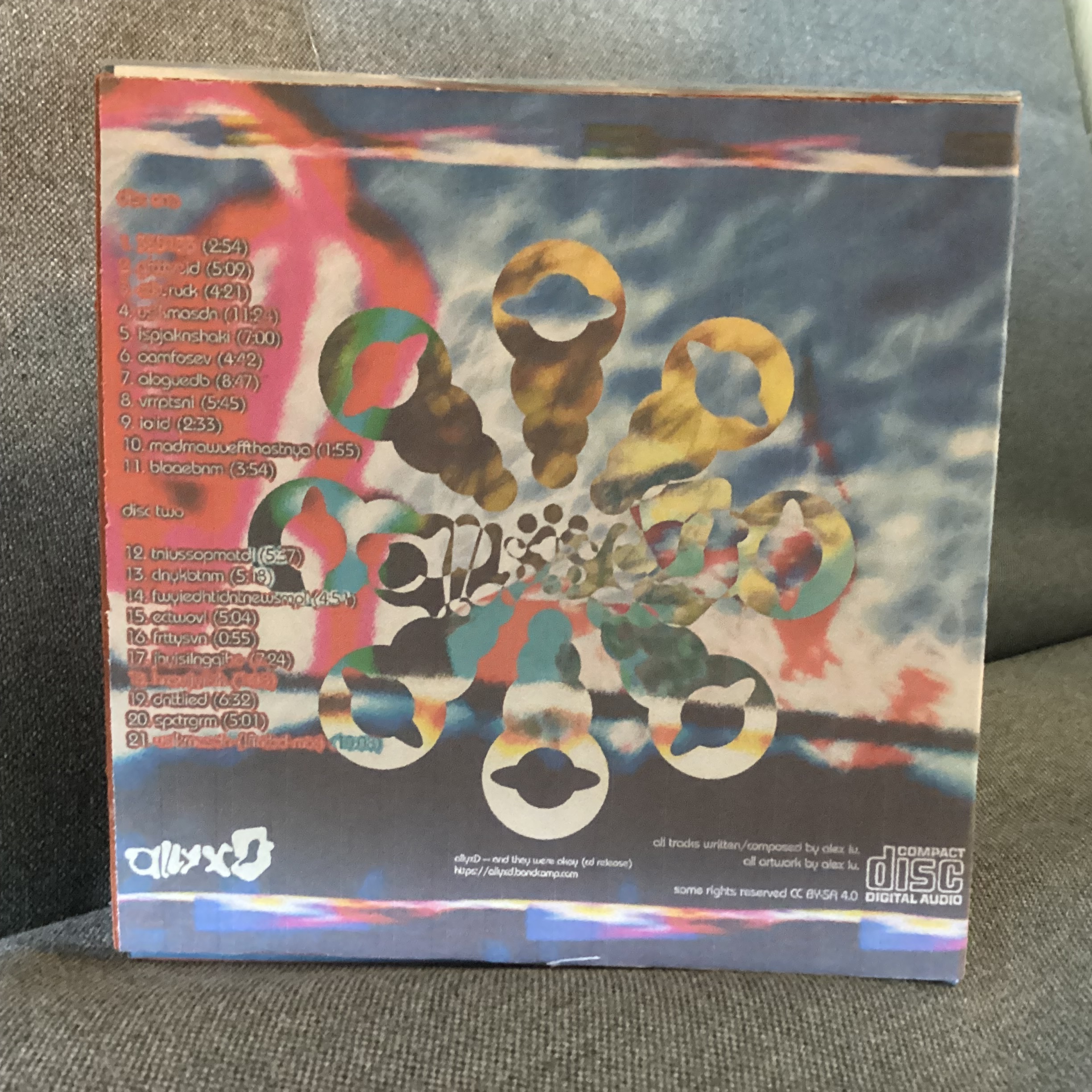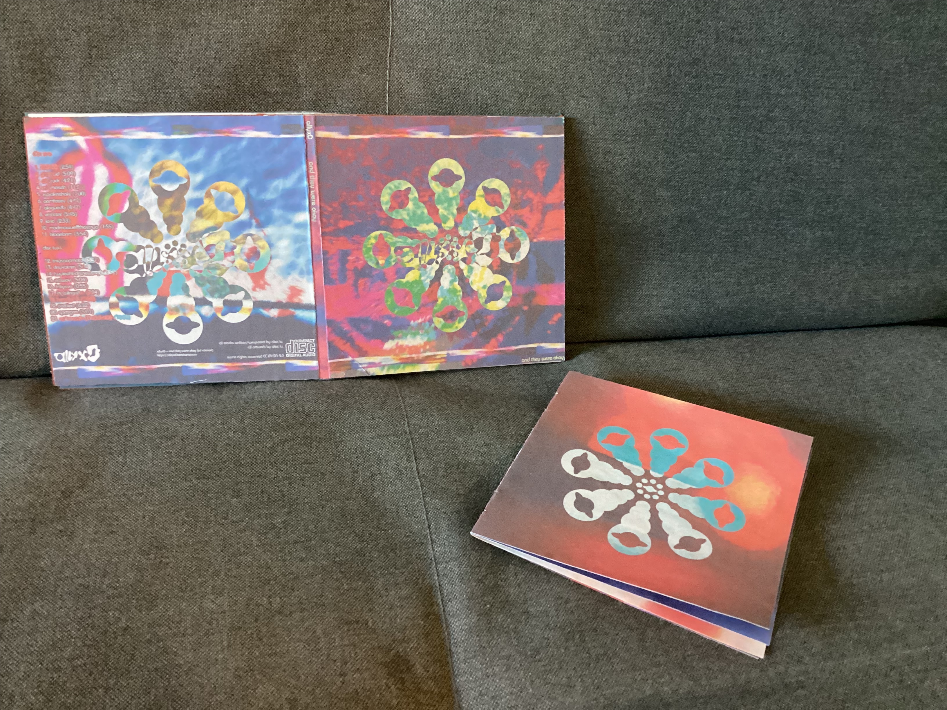 notes: [ALX002CD] just like the and they were okay cd, the album was too big so i must use two discs. i tried to make a mini version of a double gatefold vinyl sleeve, hoping that it would be high quality...and i failed miserably. still, it is better than the and they were okay sleeve. the left panel holds the booklet and the right panel holds the two cds, with their own individual paper sleeves too.